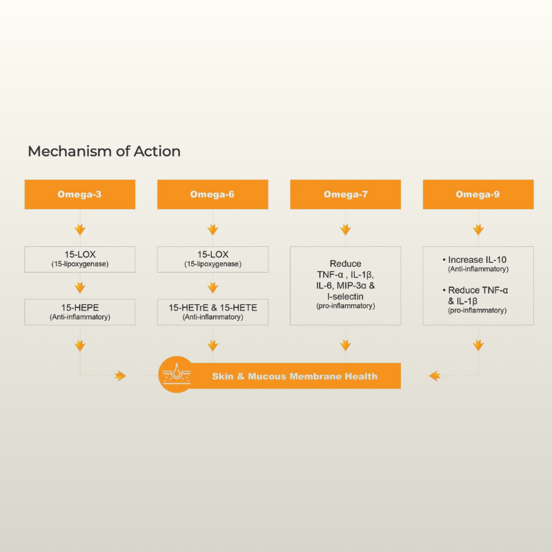 Omegia™ kombiniert essentielle Fettsäuren (Omega-3, -6, -7 und -9) und Antioxidantien, die die Haut und die Schleimhäute nähren.