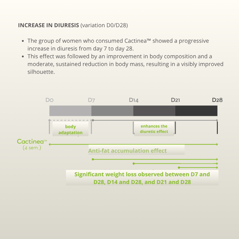 1. Bisson et al., 2010. Diuretic and antioxidant effects of Cactinea, a dehydrated water extract of the prickly pear fruit, in rats.2. Galati et al., 2002. Biological effect of debris from Opuntia ficus indica (L.) Mill. (Cactaceae): Note I: diuretic activity.3. Clinical trial not published in 2009: parallel group, randomized versus placebo, double blind, 47 women, administration of 2 g of CactiNea for 28 days. 4. Tesoriere, L. et al. 2004. Supplementation with cactus fruit (Opuntiaficus-indica) decreases oxidative stress in healthy humans: a comparative study with vitamin C. 5. Attanzio et al.,2018. Short-term cactus [Opuntia ficus-indica (L. ) Mill] fruit supplementation improves the inflammatory profile and is associated with better antioxidant status among healthy humans. 6. Khouloud et al., 2018. The effect of supplementation with Opuntia ficus_indica juice on stress.