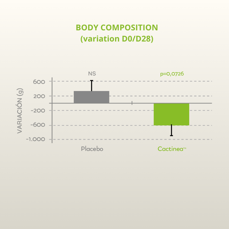 - A statistically significant reduction in total body mass was observed in the Cactinea™ group, unlike what occurred in the placebo group.