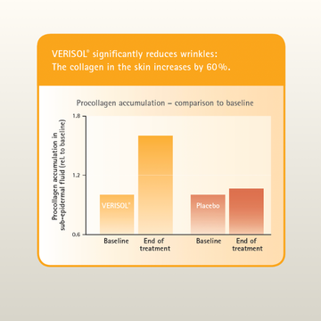 A clinical study conducted with more than 100 women aged between 45 and 65 years, demonstrates that oral administration of VERISOL® (2.5 g/day) significantly reduces wrinkles after 4 weeks and causes a significant increase in the concentration of procollagen in the skin.