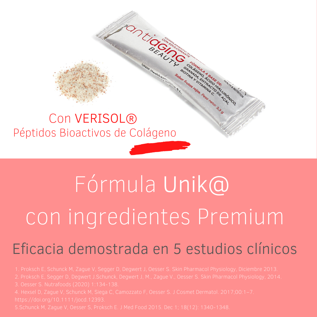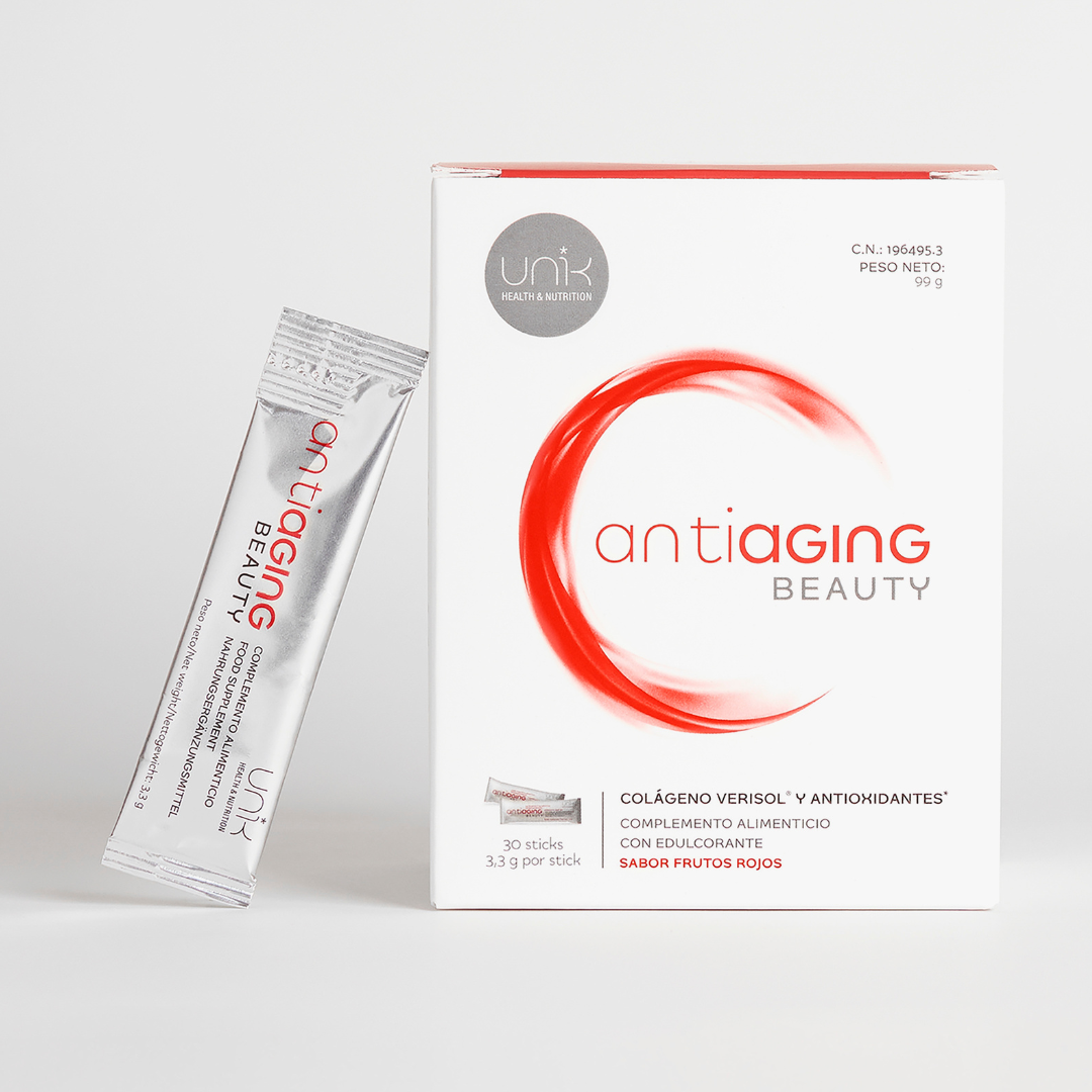 Unik Antiaging Beautuy is a Nutricosmetic formulated with a unique combination of VERISOL® bioactive Collagen Peptides, Hyaluronic Acid, and antioxidants: Pomegranate, Açai Extract, Biotin and Vitamin C. It acts on the skin, improving its firmness and reducing the appearance of fine lines. expression and wrinkles. Enhances the beauty of hair and nails.
