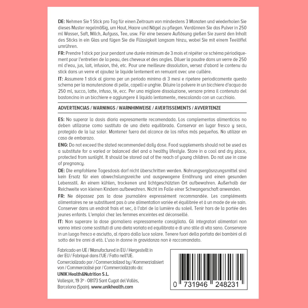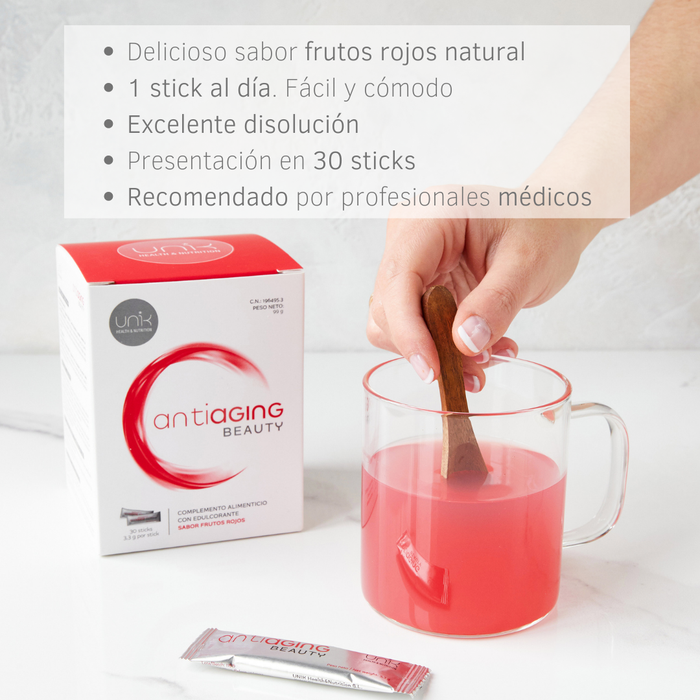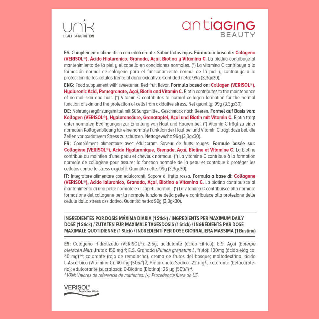 Unik Antiaging includes Bioactive Collagen Peptides (Verisol®) , Hyaluronic Acid , Pomegranate , Açai Extract , Biotin and Vitamin C and has a delicious natural red fruit flavor . You'll love it! and it will be very easy for you to incorporate it into your daily beauty routine.