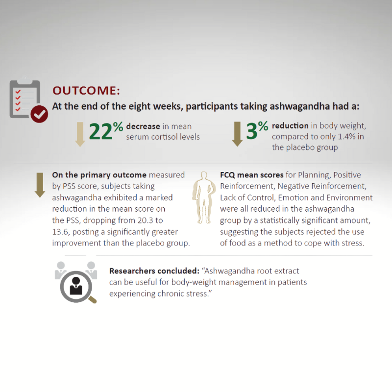 KSM-66® Ashwagandha favorece la gestión del peso corporal en adultos bajo estrés, ayudando a reducir la masa corporal y los niveles de cortisol, mientras mejora el equilibrio emocional y la relación con la comida.